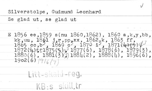 //// Silverstolpe , Gudmund Leonhard Se glad ut, se glad ut //// E 1856 ee,1859 s(nu 1860,1862), 1860 a,k,y,bb, kk,uu, 180_ jr,pp7xx, 1862,k, 1863 ff, //// 1865 ce,b;1 1869 922 1870 VI 1871(415)T //// 1872(40tt1875e5)),' 1877(6), 1878(6), 1 79(3), //// 1883(6), 1881(5)4)1884(2), 1888(4), 1896(6), //// 1902(6) :''''t4(7 i //// 1:Adi.J -Feg, //// KB:s s da.tr ////