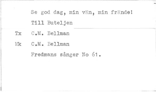 //// Se god dag, min vän, min frände! //// Till Buteljen //// Tx C.M. Bellman //// Mk C.M. Bellman //// Fredmans sånger No 61. ////