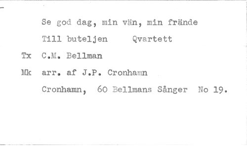 //// Se god dag, min vän, min frände //// Till buteljen Qvartett //// Tx C.M. Bellman //// Mk arr, af J.P. Cronhamn //// Cronhamn, 60 Bellmans Sånger No 19. ////