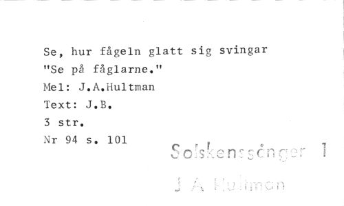//// Se, hur fågeln glatt sig svingar //// "Se på fåglarne." //// Mel: J.A.Hultman //// Text: J.B. //// 3 str. //// Nr 94 s. 101 ////