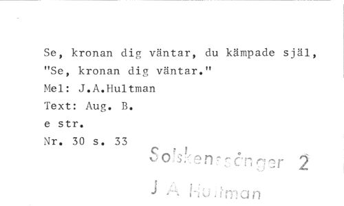 //// Se, kronan dig väntar, du kämpade själ, //// "Se, kronan dig väntar." //// Mel: J.A.Hultman //// Text: Aug. B. //// e str. //// Nr. 30 s. 33 //// Cri r°5 r //// vgG //// Kin ////