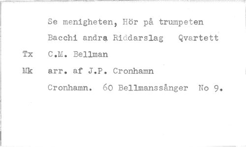 //// Se menigheten, Hör på trumpeten Bacchi andre. Riddarslag Qvartett Tx C.M. Bellman //// Mk arr. af J.P. Cronhamn //// Cronhamn. 60 Bellmanssånger No 9. ////