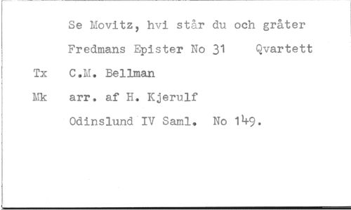 //// Se Movitz, hvi står du och gråter //// Fredmans Epister No 31 Qvartett //// Tx C.M. Bellman //// Mk arr. af H. Kjerulf //// Odinslund IV Saml. No 149. ////
