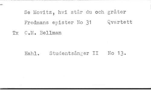 //// Se Movitz, hvi står du och gråter //// Fredmans epister No 31 Qvartett //// Tx C.M. Bellman //// Hahl. Studentsåner II No 13. ////