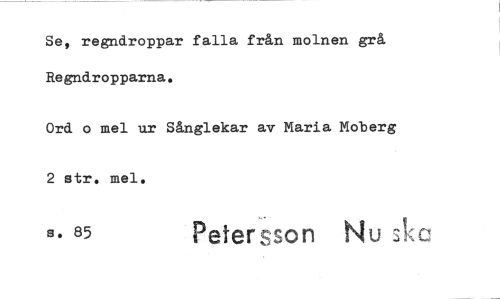 //// Se, regndroppar falla från molnen grå Regndropparna. //// Ord o mel ur Sånglekar av Maria Moberg 2 str. mel. //// s. 85 Petersson N ////