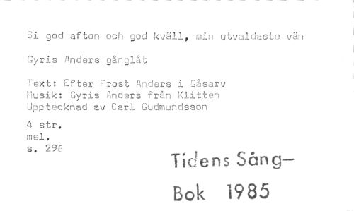 //// Si god afton och god kväll, nin utvaldaste vän //// flyris änders gånglåt //// Text: Efter Frost Anders i Gåsarv Musik: Gyris Anders frän Klitten Upptecknad av Carl Gudmundsson //// 4 str. mel. s. 29° //// Tidens Sang- //// Bok 1985