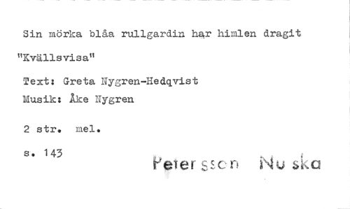 //// Sin mörka blåa rullgardin har himlen dragit //// "Kvällsvisa" //// Text: Greta Nygren-Hedqvist Musik: Åke Nygren //// 2 str. mel. s. 143 //// tretersscn
