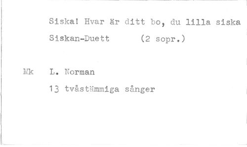 //// Siska! Hvar är ditt bo, du lilla siska //// Siskan-Duett (2 sopr.) //// L. Norman //// 13 tvåstämmiga sånger
