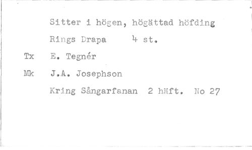 //// Sitter i högen, högättad höfding Rings Drapa 4 st. //// Tx E. Tegnér Mk J.A. Josephson //// Kring Sångarfanan 2 häft, No 27