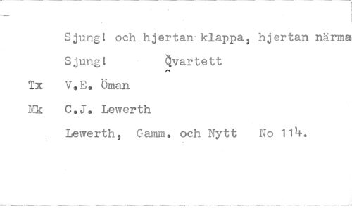 //// Sjung! och hjertan klappa, hjertan närma Sjung! Qvartett //// Tx V.E. Oman Mk C.J. Lewerth //// Lewerth, Gamm. och Nytt No 114.