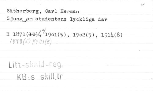 //// Sätherberg, Carl Herman Sjung^pm studentens lyckliga dar //// E 1871(^4^1901(5), 1902(5), i9i!+(8) //// Litt-s. -tj-r^g, KB.s skiH.tr