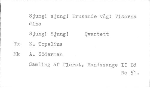 //// Sjung! sjung! Brusande våg! Visorna dina //// Sjung! Sjung! Qvartett Z. Topelius A. Söderman //// Samling af flerst. Mandssange II Bd //// No 51.