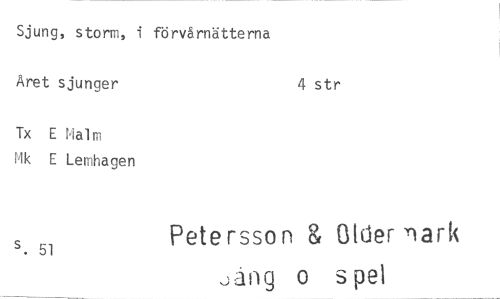//// Sjung, storm, i förvårnätterna //// Året sjunger 4 str //// Tx E Malm Mk E Lemhagen //// < Petersson & Otder ^ark //// 51 //// jäng o spei