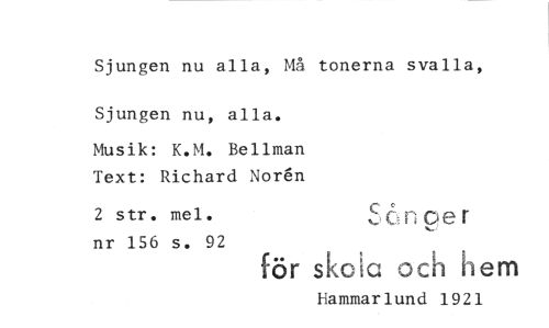 //// Sjungen nu alla, Må tonerna svalla, //// Sjungen nu, alla. //// Musik: K.M. Bellman Text: Richard Norén //// 2 str. mei. Sånger //// nr 156 s. 92 //// för skota och hem //// Hammarlund 1921