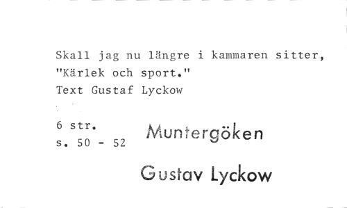 //// Skall jag nu längre i kammaren sitter, "Kärlek och sport." //// Text Gustaf Lyckow //// ^ Muntergöken //// s. 50 - 52 ^ //// Gustav Lyckow