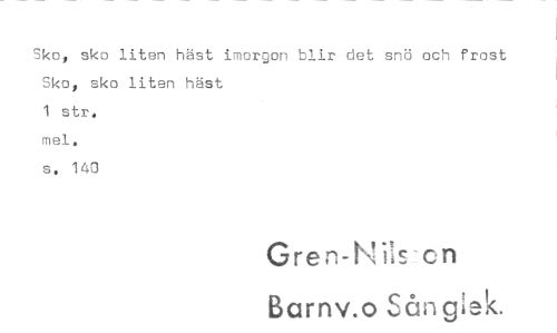 //// Sko, sko liten häst imorgon blir dst snö och frost Sko, sko liten häst 1 str. mel. s. 140 //// Gren-N:!s cn Barrtv.o Sångiek.