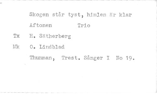 //// Skogen står tyst, himlen är klar //// Aftonen Trio //// Tx H. Sätherberg Mk 0. Lindblad //// Thunman, Trest. Sånger I No 19*