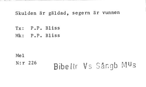 //// Skulden är gäldad, segern är vunnen //// Tx: P.P. Bliss Mk: P.P. Bliss //// Mel //// N:r 226 //// B ibeftr Vs Sår.gb