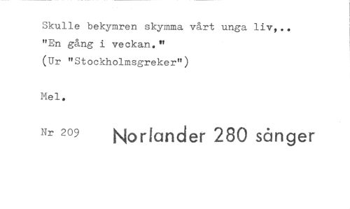 //// Skulle bekymren skymma vårt unga liv,.. "En gång i veckan." //// (Ur "Stockholmsgreker") //// Mel. //// Nr 209 Noriander 280 sånger
