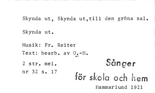 //// Skynda ut, Skynda ut,till den gröna sal //// Skynda ut. //// Musik: Fr. Reiter Text: bearb. av O.-H. //// 2 str. mel. OGf* //// för s!(cia och hem //// Hammarlund 1921