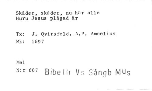 //// Skåder, skåder, nu här alle Huru Jesus plågad är //// Tx: J. Qvirsfeld. A.P. Amnelius Mk: 1697 //// Mel //// N:r 607 v g Sångb M^s