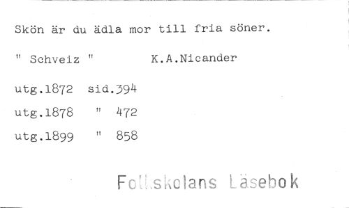 //// Skön är du ädla mor till fria söner. //// " Schveiz " K.A.Nicander //// utg.1872 sid.394 utg.1878 " 472 utg.1899 " 858 //// FcLskctans Läsebok