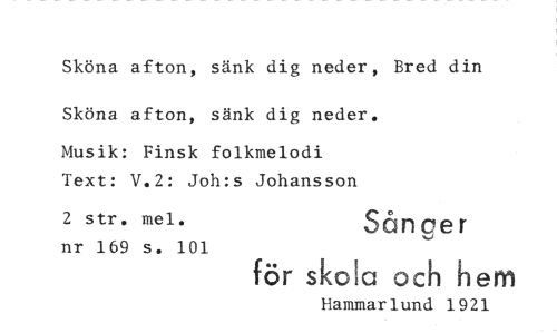 //// Sköna afton, sänk dig neder, Bred din //// Sköna afton, sånk dig neder. //// Musik: Finsk folkmelodi Text: V.2: Joh:s Johansson //// 2 str. mei. Såncer //// nr 169 s. 101 ^ //// för skota och hem //// Hammarlund 1921