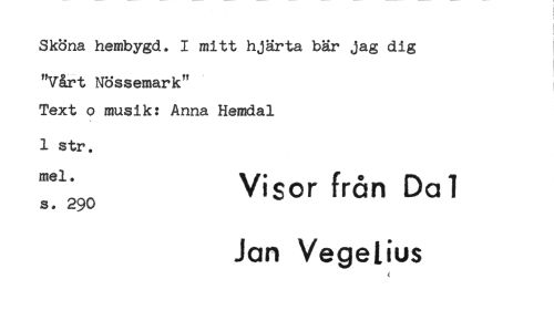 //// Sköna hembygd. I mitt hjärta bär jag dig //// "Vårt Mössemark" //// Text o musik: Anna Hemdal //// lstr. //// "***' Visor från Dal //// s. 290 //// Jan Vegetius