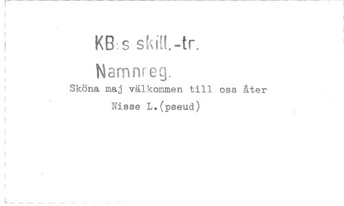 //// I KB s sM!.-tr. ; Namnreg. //// I Sköna maj välkommen till oss åter //// I Nisse L.(pseud) //// i //// I //// L.