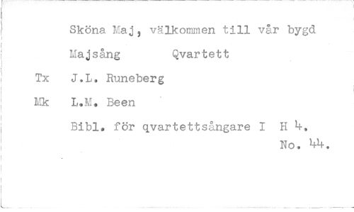 //// Sköna Maj, välkommen till vår bygd //// Majsång Qvartett //// Tx J.L, Runeberg //// Mk L.M, Been //// Bibi. för qvartettsångare I H 4. //// No, 44.