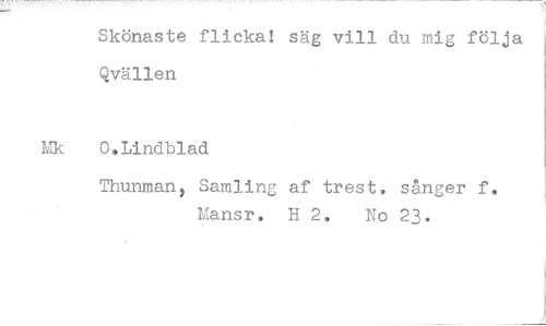 //// Skönaste flicka! säg vill du mig följa Qvällen //// 0.Lindblad //// Thunman, Samling af trest. sånger f. Mansr. H 2. No 23.