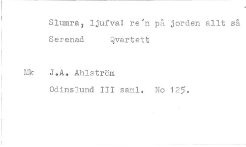 //// Slumra, ljufva! re'n på jorden allt så //// Serenad Qvartett //// Mk J.A. Ahlström //// Odinslund 111 saml. No 125.