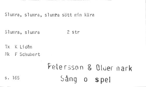 //// Slumra, slumra, slumta sött min kära //// Slumra, slumra //// Tx K Liden Mk F Schubert //// s. 165 //// 2str //// Pete rsson & Qtuer nark Sång o spe]