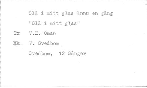 //// Slå i mitt glas ännu en gång "Slå i mitt glas" //// Tx V.E. Öman Mk V. Svedbom //// Svedbom, 12 Sånger