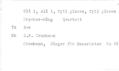 //// Slå i, slå i, fyll glasen, fyll glasen Dryckes-Sång Qvartett Tx B-r //// Mk J.P. Cronhamn //// Crohhamn, Sånger for Mansröster No 18