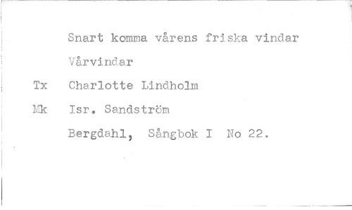 //// Snart komma vårens friska vindar Vårvindar //// Charlotte Lindholm //// Isr. Sandström //// Bergdahl, Sångbok I No 22.