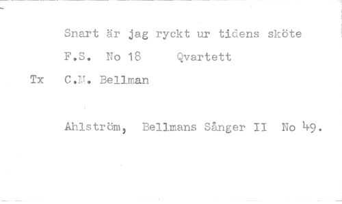 //// Snart är jag ryckt ur tidens sköte F,S. No 18 Qvartett C,M. Bellman //// Ahlström, Bellmans Sånger II No 4$.