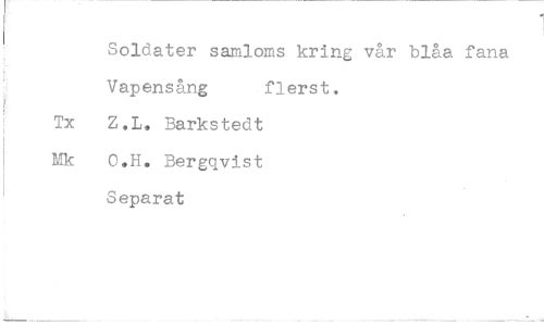 //// Soldater samloms kring vår blåa fana Vapensång flerst. //// Tx Z,L. Barkstedt Mk O.H. Bergqvist Separat