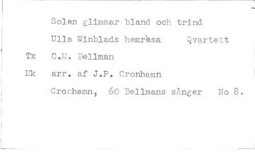 //// Solen glimmar bland och trind //// Ulla Winblads hemrbsa Qvartett //// C.M. Bellman //// arr. af J.P. Cronhamn //// Cronhamn, 60 Bellmans sånger No 8.
