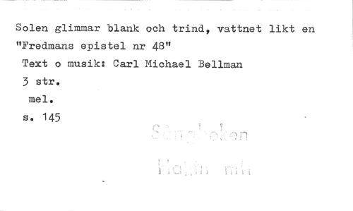 //// Solen glimmar blank och trind, vattnet likt en "Fredmans epistel nr 43" //// Text o musik: Carl Michael Bellman //// 3 str. mel. s. 145 //// ?