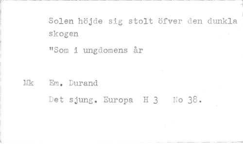 //// Solen höjde sig stolt öfver den dunkla skogen //// "Som i ungdomens år Em. Durand //// Det sjung. Europa H 3 No 38.