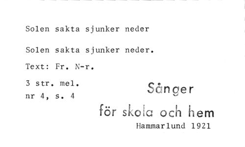 //// Solen sakta sjunker neder //// Solen sakta sjunker neder. //// Text: Fr. N-r. //// 3 str. mel. ^ //// nr 4, s. 4 //// för s^oia och hem //// Hammarlund 1921 //// ^énper