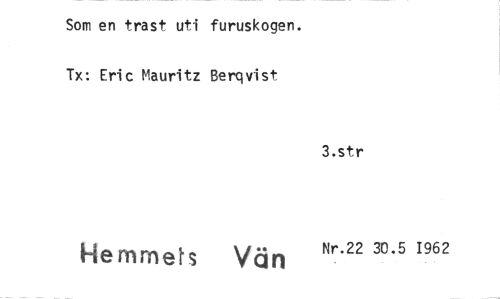 //// Som en trast uti furuskogen. //// Tx: Eric Mauritz Be rq vi st //// 3.str //// Hemmets Vän