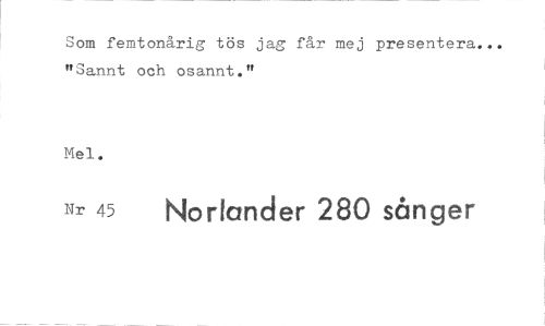//// Som femtonårig tös jag får mej presentera. "Sannt och osannt." //// Mel. //// Nr 45 Nortander 280 sånger