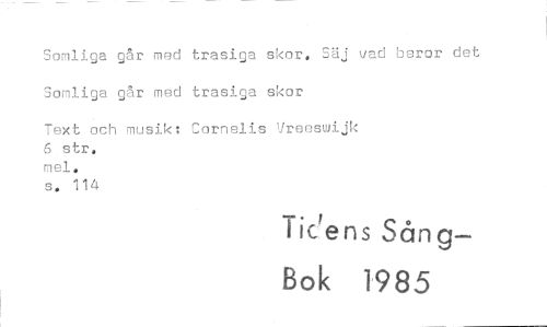 //// Somliga går med trasiga skor, Säj vad beror det //// Sonliga går med trasiga skor //// Text och musik: Comelis VreesVJijk //// 6 str, //// mel. //// s. 114 //// Tic'ens Sång- //// Bok