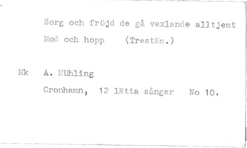 //// Sorg och fröjd de gå vexlande alltjemt Mod och hopp (Trestäm.) //// A. Miihling //// Cronhamn, 12 lätta sånger No 10.