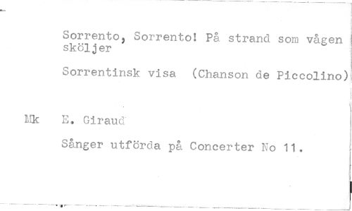 //// Sorrento, Sorrento! På. strand som vågen sköljer //// Sorrentinsk visa (Chanson de Piccolino) E. Giraud //// Sånger utförda på Concerter No 11.