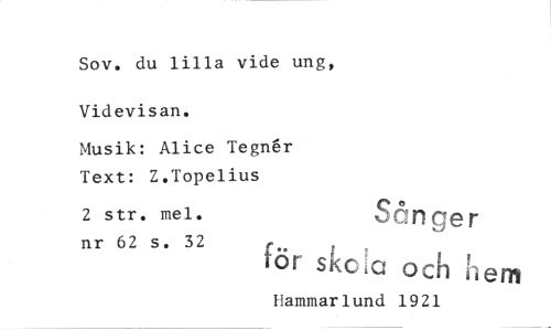 //// Sov. du lilla vide ung, //// Videvisan. //// Musik: Alice Tegnér Text: Z.Topelius //// 2 str. mei. Sånger //// nr 62 s. 32 ^ //// <or sKoia och !i //// Hammarlund 1921