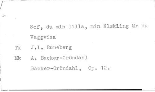 //// Sof, du min lilla, min älskling är du Vaggvisa Tx J.L. Runeberg Mk A, Backer-Cröndahl //// Backer-Cröndahl, Op, 12.