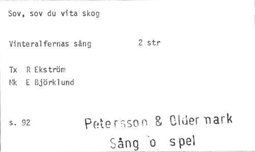 //// Sov, sov du vita skog //// Vinteralfernas sång 2 str //// Tx R Ekström Mk E Björklund //// s. 92 Petersson & //// Sång o //// Ctder nark spe!